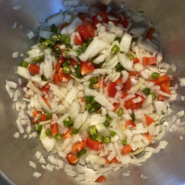 Mix together the onion, red bell pepper and hot peppers. If you don't have a blender or grinder for the hot peppers, you can dice them up in small pieces.